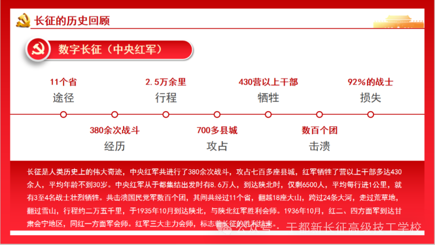 此次开学第一课,既是一次深刻的党史学习教育,更是一堂生动的工匠精神培育课。学校将持续以长征精神为引领,把思政教育融入技能人才培养全过程,引导学生在红色基因传承中坚定理想信念,在技能锤炼中涵养匠心,走好新时代的“技能长征路”,为实现中华民族伟大复兴贡献青春力量!