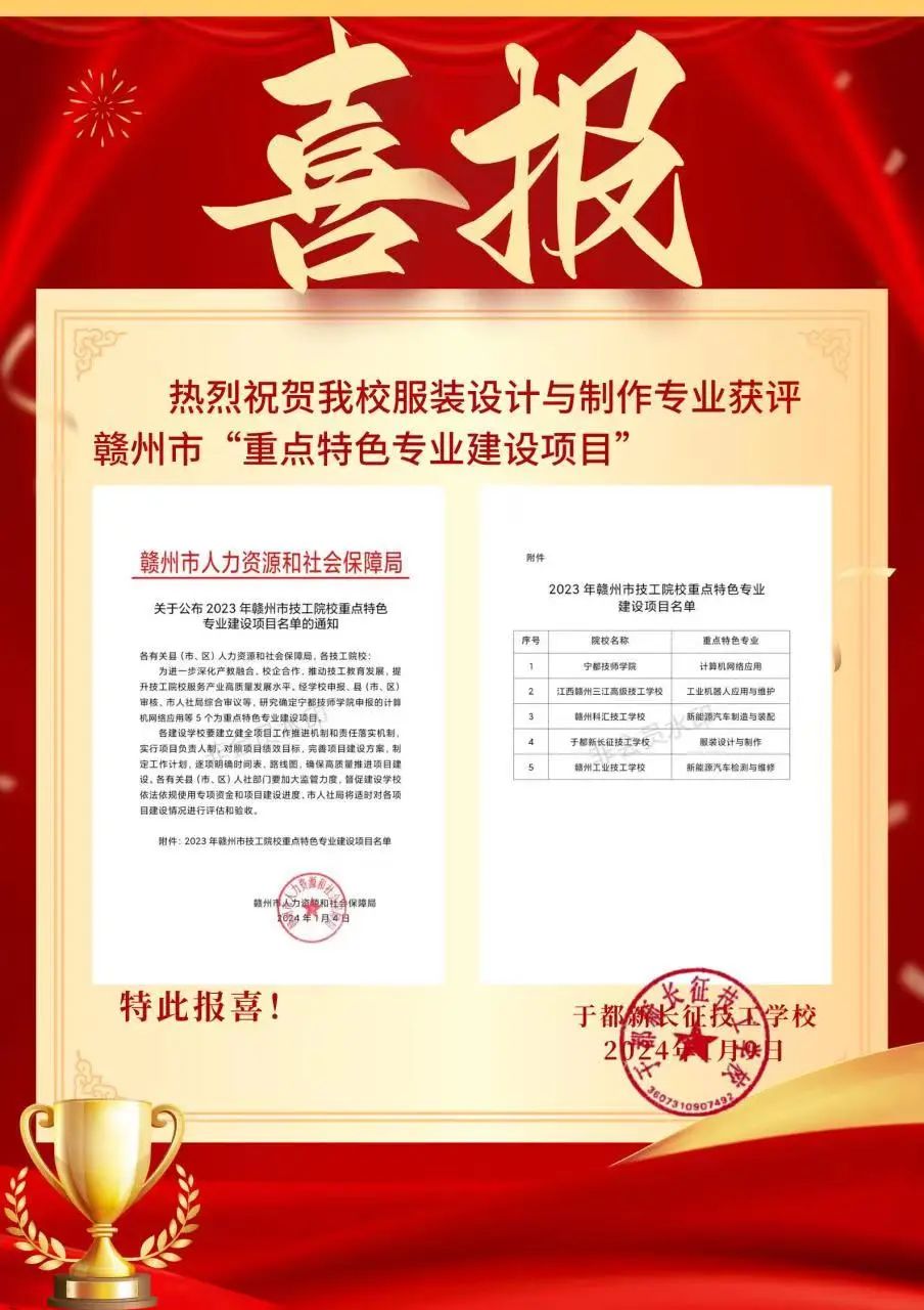 2.在2023年赣州市技工院校重点特色专业建设项目评选中,我校服装设计与制作专业获评赣州市“重点特色专业建设项目”。