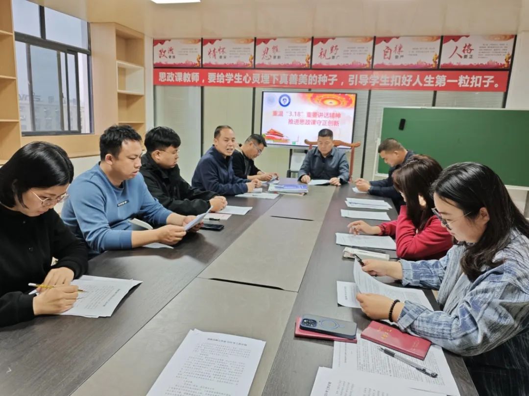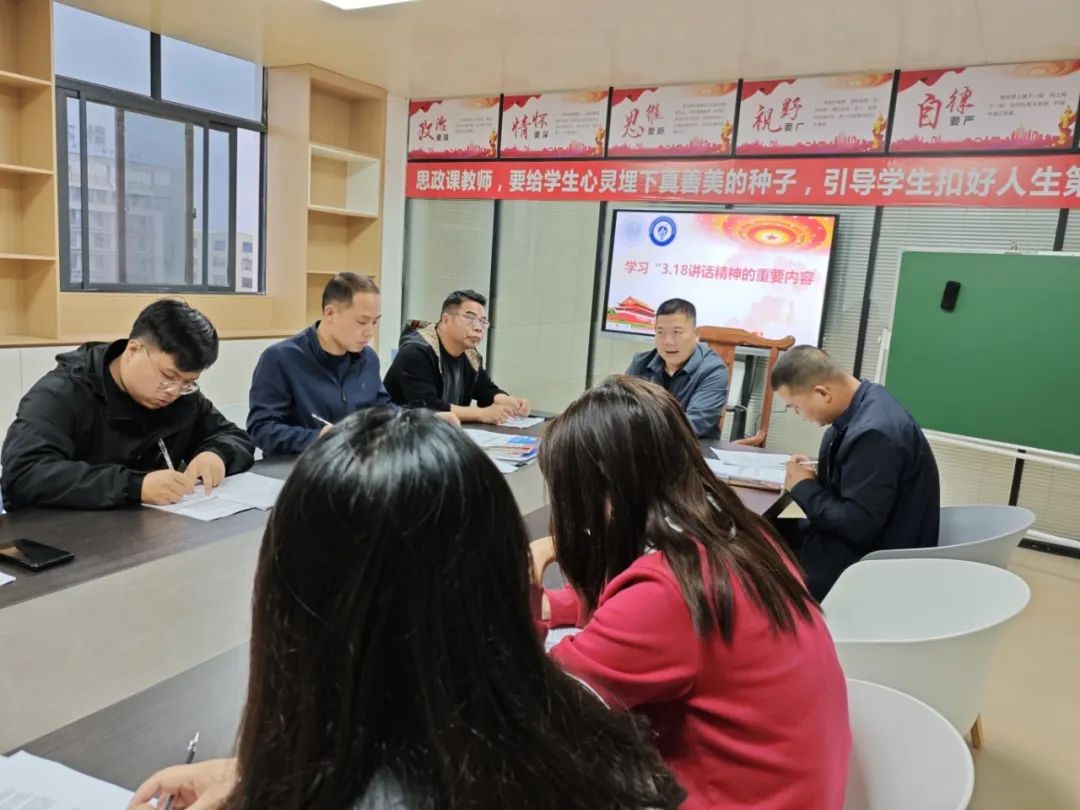 全体思政课教师要提高政治站位,增强主动性、自觉性。进一步系统学习习近平新时代中国特色社会主义思想和习近平总书记重要指示批示精神、今年全国两会期间的重要讲话精神,特别是要以此次会议为新起点,进一步学深悟透习近平总书记“3.18”重要讲话内涵、实质,切实用习近平新时代中国特色社会主义思想凝心聚魂,切实履行职责,推动落实立德树人根本任务。要持续优化“三全育人”工作格局。学校党政部门要进一步重视思政课,思政工作室、教务处教研处统筹安排好全校学生思想政治教育工作,形成党支部统一领导、党政齐抓共管、团委牵头协调、系部协同落实的“三全育人”工作格局。要勇于担当,履职尽责,进一步推进学校内涵建设。要对标习近平总书记“3.18”重要讲话精神和《技工教育“十四五”规划》,提升课堂教学效果,激发学生学习思政课的内生动力。