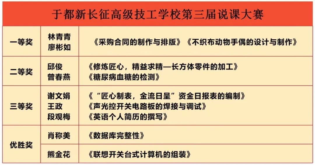 举办说课比赛可以激发教师们的学习热情,促进教师深入研究和思考教学内容,提高教学设计质量,推动教学改革。本次说课大赛圆满结束。获奖教师如下: