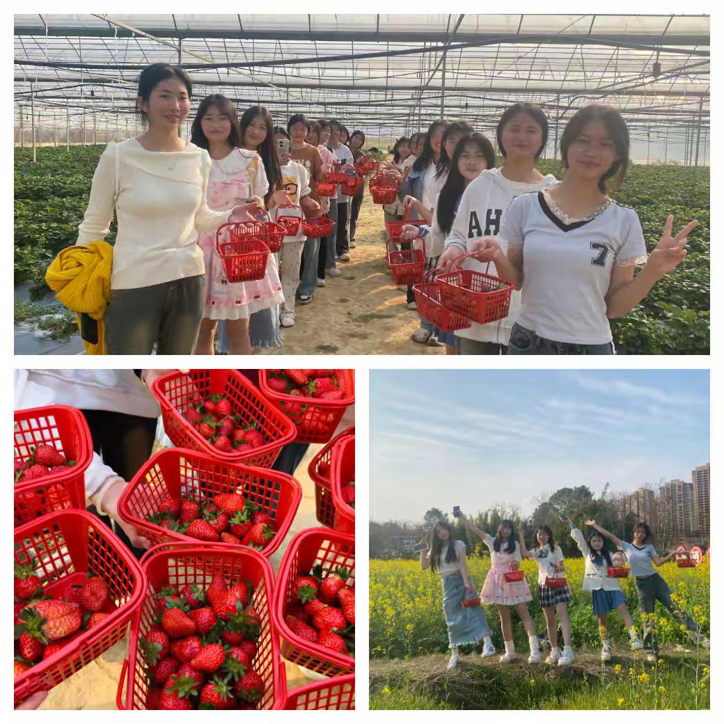 短暂休整过后,大家移步至附近的草莓园,开启期待已久的草莓采摘活动。漫步于整齐翠绿的田垄间,一颗颗鲜红饱满的草莓让人垂涎欲滴。师生们挑选、品尝、交流心得,不仅收获了香甜可口的果实,也在亲近自然的过程中体悟到劳动的乐趣与珍贵。