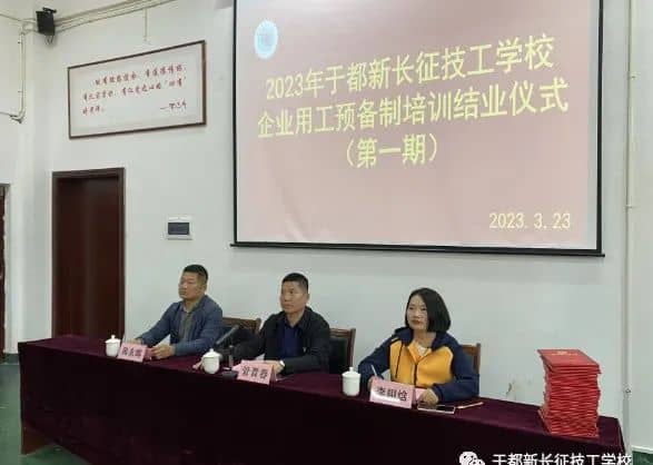3月23日下午,于都县企业用工预备制培训结业仪式在于都新长征技工学校举行。县就业创业服务中心培训股股长周永辉,学校党支部书记、校长管青春,副校长李栩焓,相关职能部门负责人及全体学员参加结业仪式。