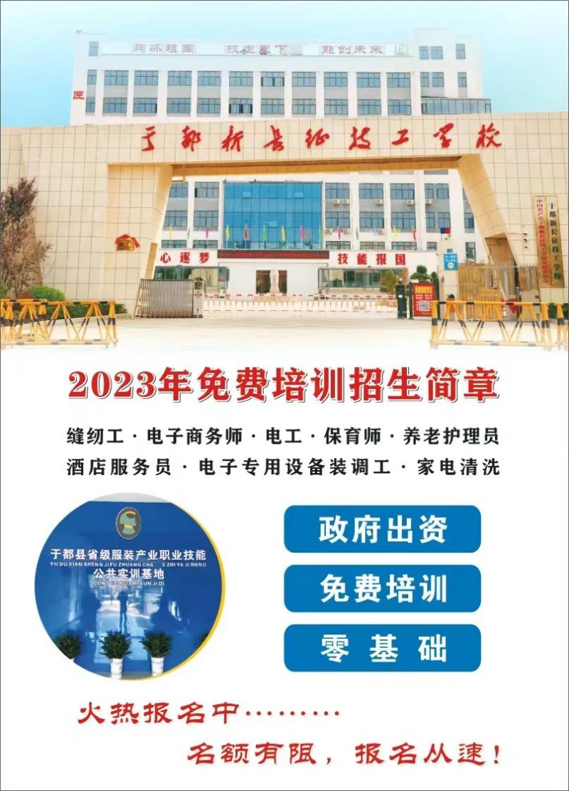 于都新长征技工学校创办于2021年4月,坐落在于都县上欧工业园区,是于都县委县政府重点建设,赣州市人力资源和社会保障局、江西省人力资源和社会保障厅重点扶持的公办技工学校。学校承接各类技能培训,设有缝纫工、电子商务师、电工、保育师、养老护理员、酒店服务员等工种培训。政府出资,免费培训,欢迎来电咨询!