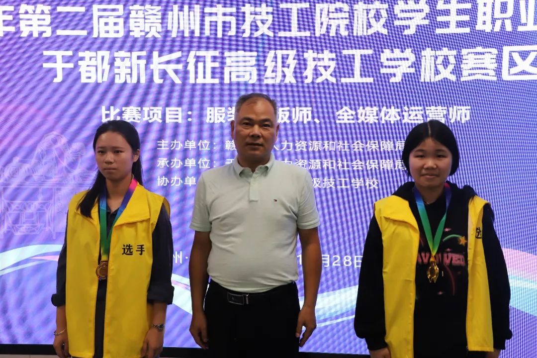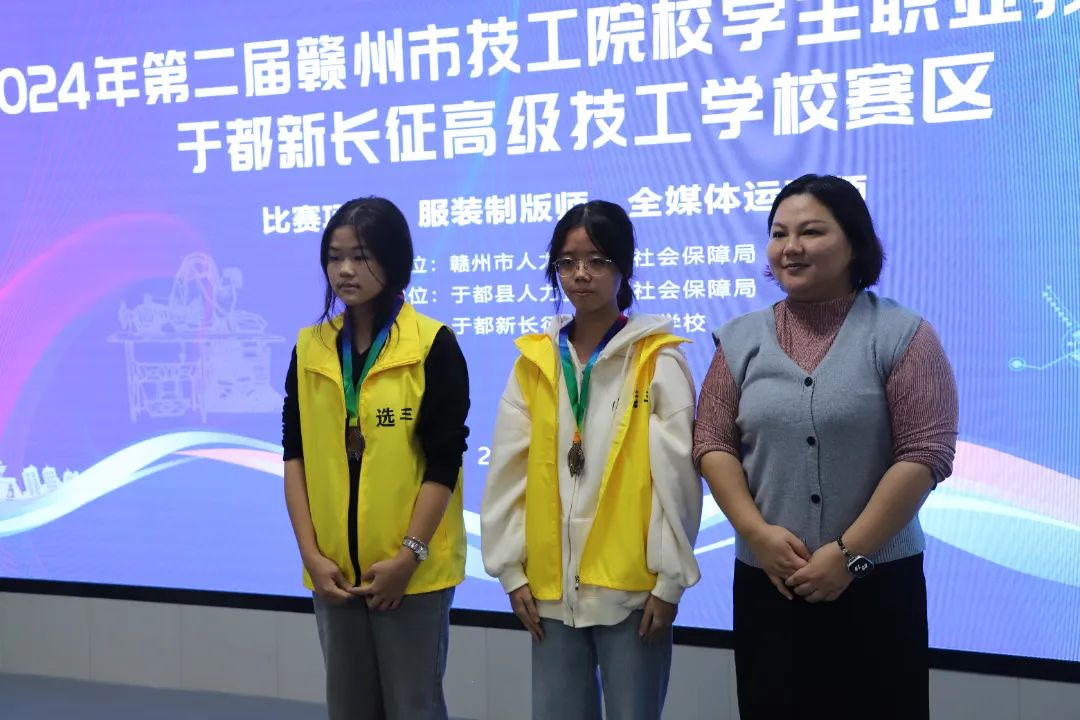 首先,由本次比赛裁判长及裁判员代表上台,对比赛进行点评,并宣布比赛成绩:服装制版师赛项由曹燕飞(于都新长征高级技工学校)、丁伟文(于都新长征高级技工学校)、郭雨竹(宁都技师学院)三位选手分别获得金银铜牌;全媒体运营师赛项由林佳佳(于都新长征高级技工学校)、宋婷(宁都技师学院)、钟芷吟(于都新长征高级技工学校)三位选手分别获得金银铜牌。