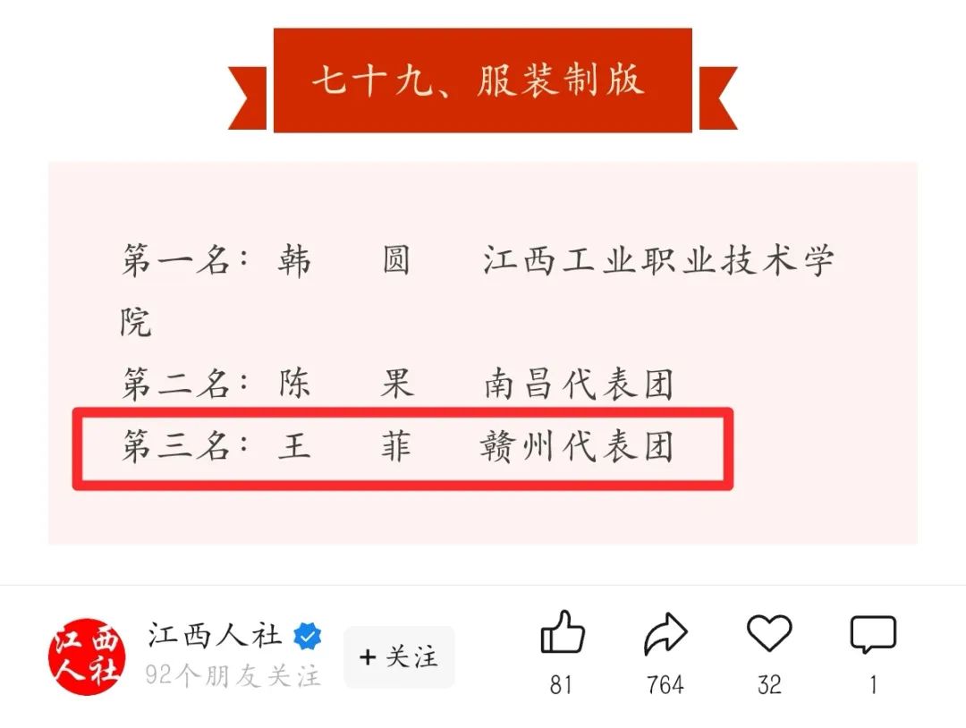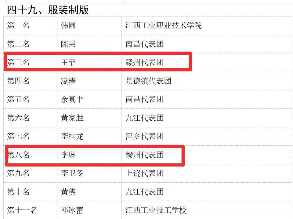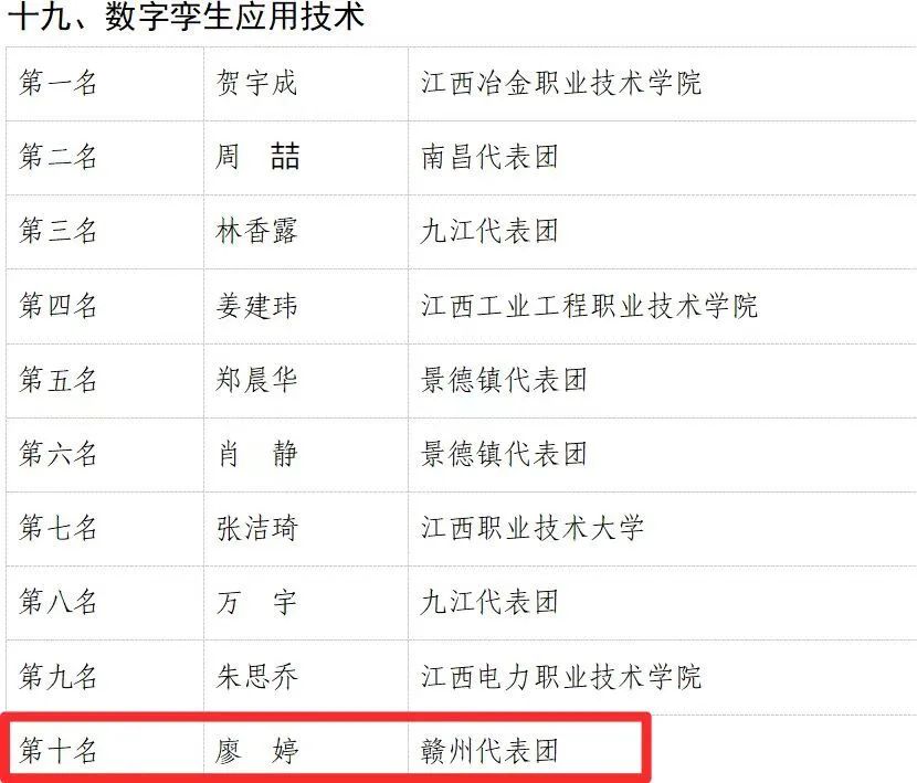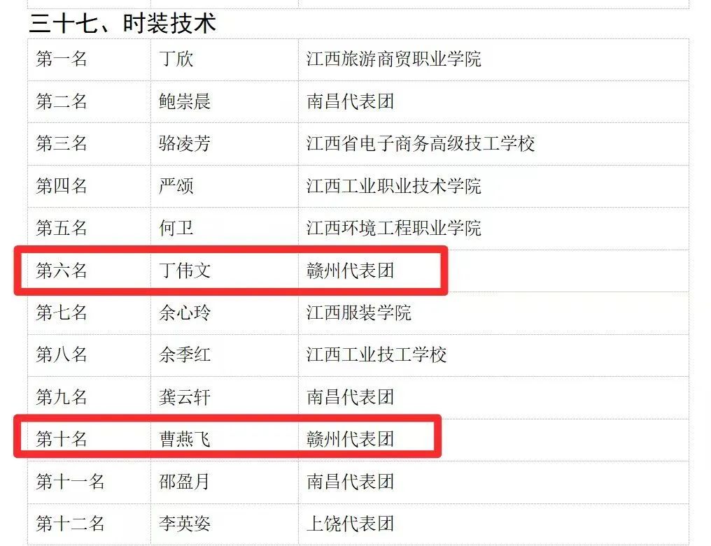 同时,我校李琳老师获得“服装制版”赛项全省第八名,廖婷老师获得“数字孪生应用技术”赛项全省第十名;我校学子丁伟文、曹燕飞分别获得“时装技术”赛项全省第六名、第十名!
