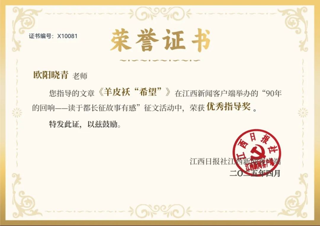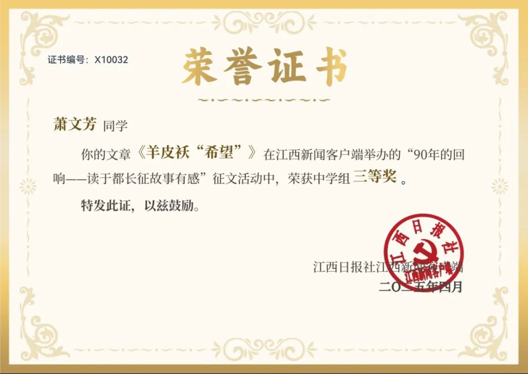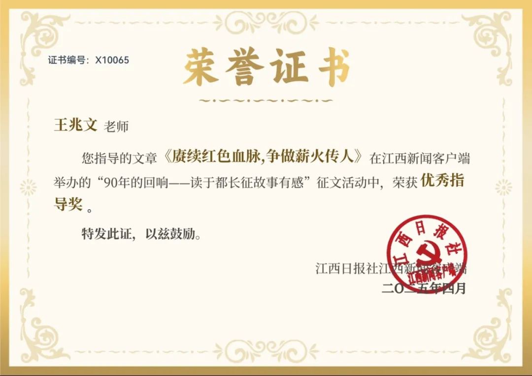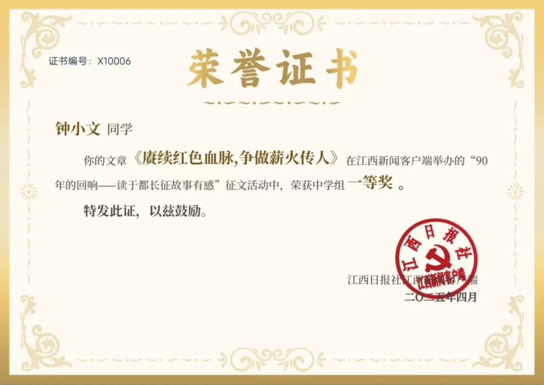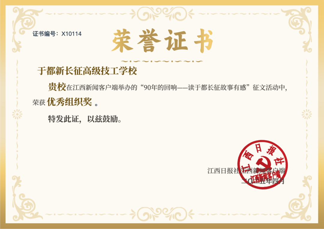 近日,由江西日报社主办、江西新闻客户端承办的“90年的回响——读于都长征故事有感”征文活动获奖名单出炉,于都新长征高级技工学校参赛学子获得一等奖1人、三等奖1人,学校荣获优秀组织奖: