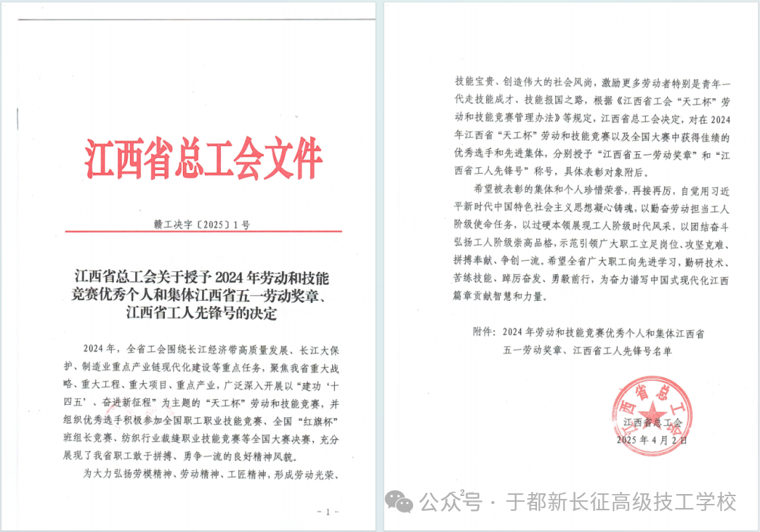 匠心铸就梦想,技能成就未来。此次荣誉的获得不仅是对我校办学成果的褒奖,更是对全体师生的激励。于都新长征高级技工学校将牢记育人使命,以“工人先锋号”和“五一劳动奖章”为引领,为谱写中国式现代化江西篇章贡献力量!