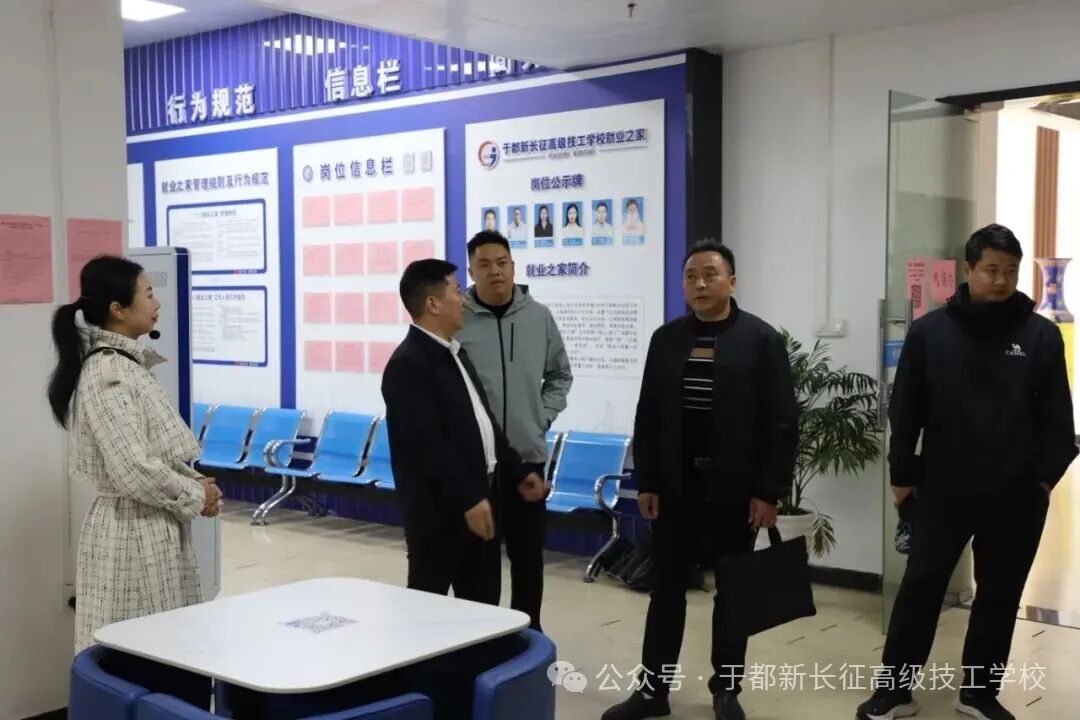 在于都县人力资源和社会保障局党组成员、新长征高级技工学校校长管青春的陪同下,考察组一行首先来到“5+2”就业之家,重点了解我校在促进毕业生高质量充分就业方面的创新举措。